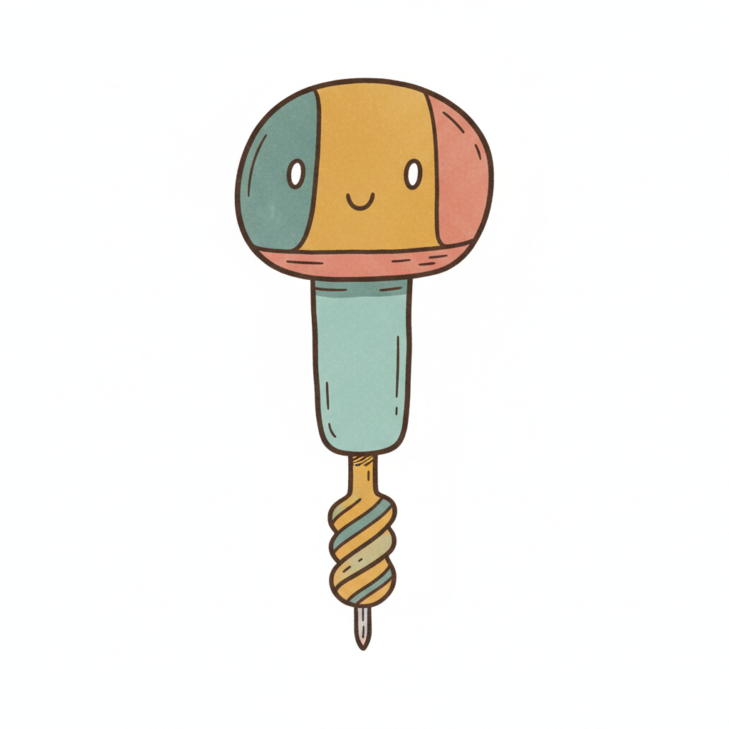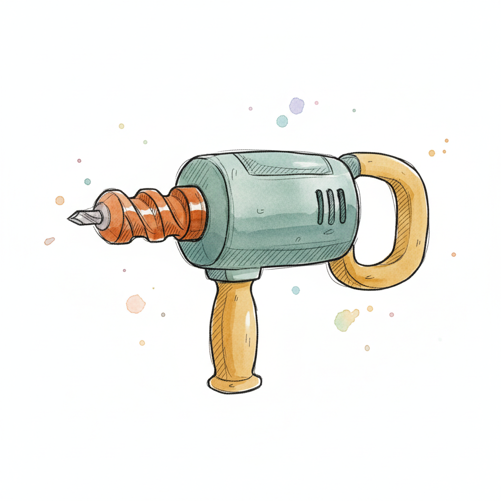 Illustration einer Bohrmaschine im Cartoon-Stil mit grünem Gehäuse und Holzgriffen.