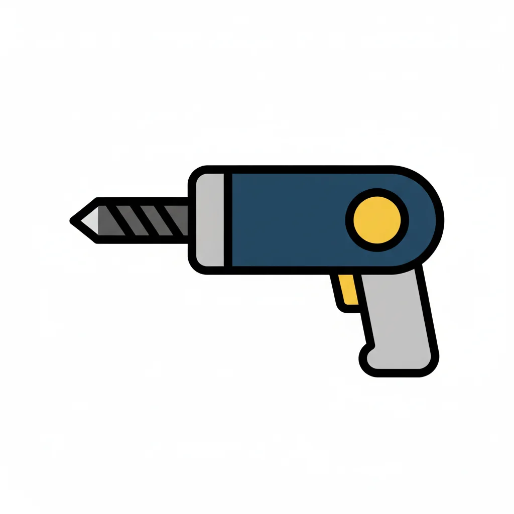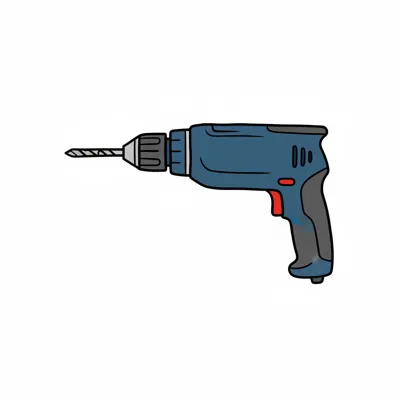 Cartoon-Darstellung einer blauen Bohrmaschine mit Bohrer und rotem Abzug auf weißem Hintergrund.