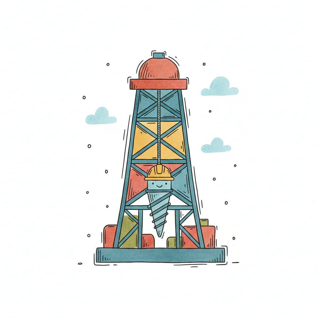 Niedliche Cartoon-Illustration eines Bohrturms mit einem lächelnden Bohrer, der einen Helm trägt.