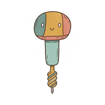 Niedliche, bunte Cartoon-Bohrmaschine mit lächelndem Gesicht auf weißem Hintergrund.