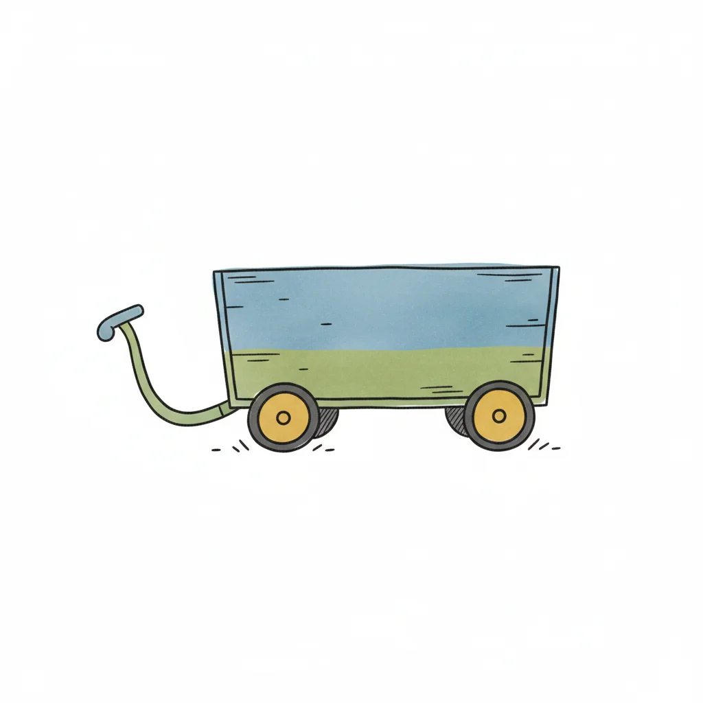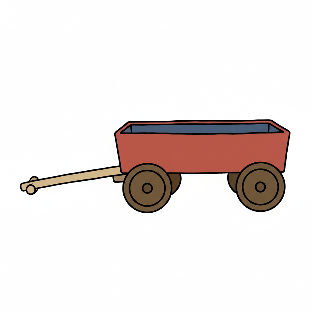 Illustration eines roten Bollerwagens mit Holzgriff und braunen Rädern auf weißem Grund.