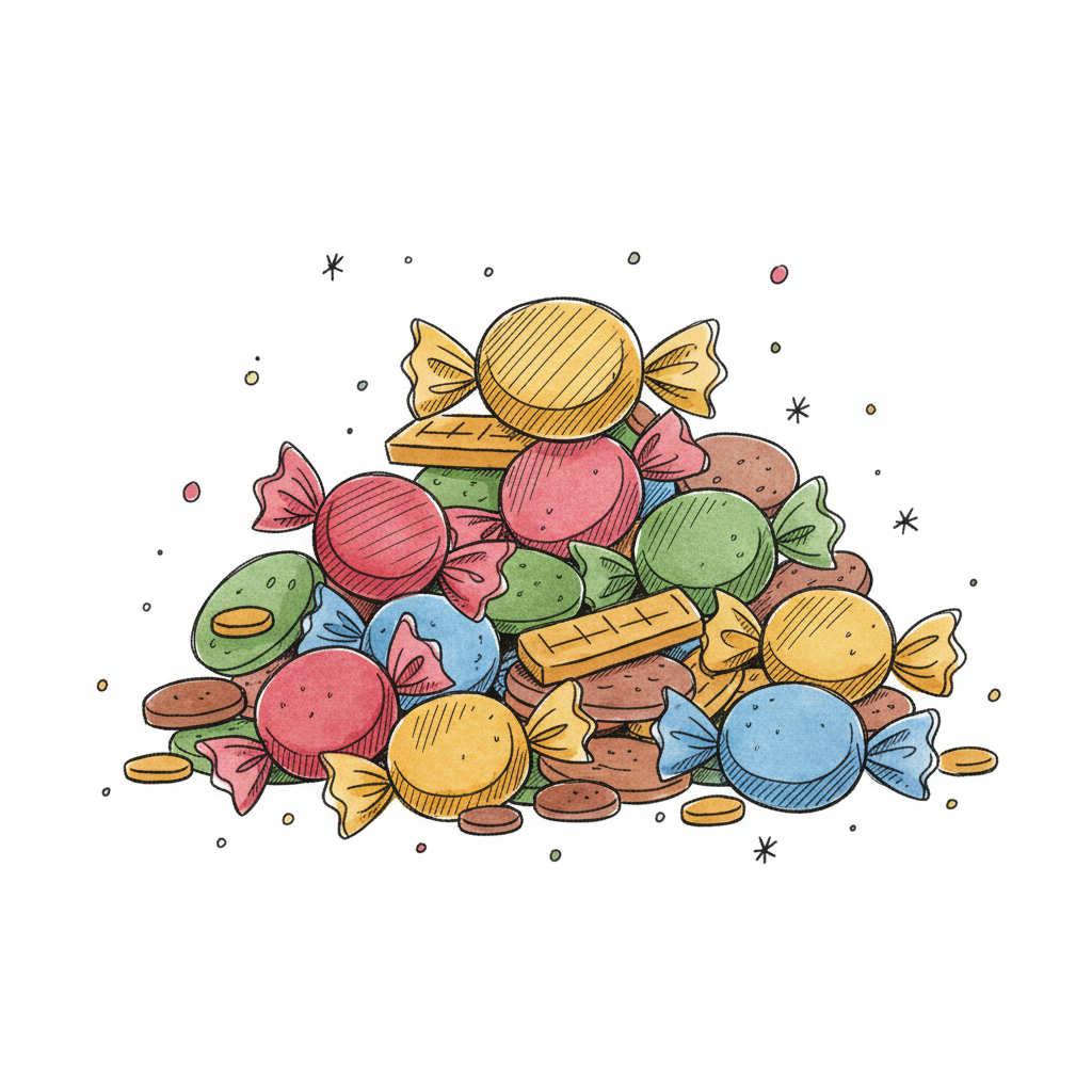 Bunter Berg aus Bonbons, Keksen und Waffeln in handgezeichnetem Stil auf weißem Grund.