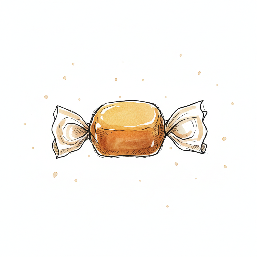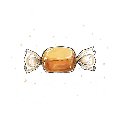 Aquarell-Illustration eines eingewickelten Karamellbonbons auf weißem Hintergrund mit leichten Sprenkeln.