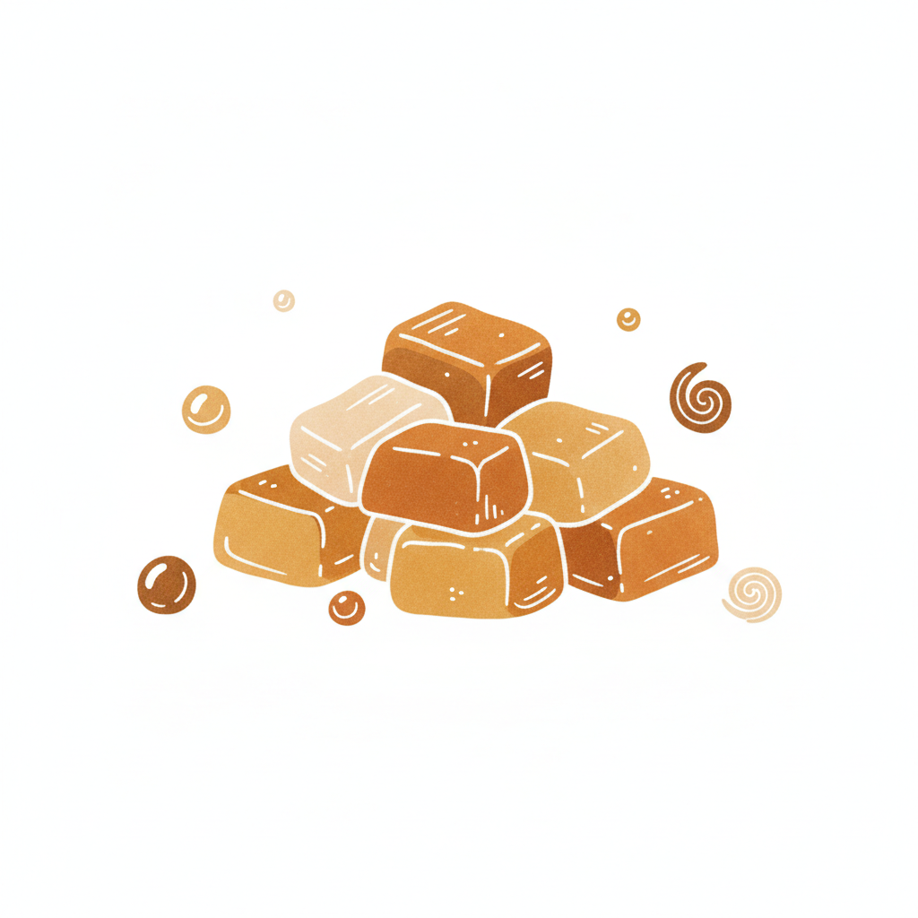 Illustration einer Ansammlung von Karamellbonbons in verschiedenen Brauntönen auf weißem Hintergrund.