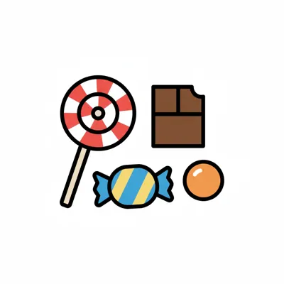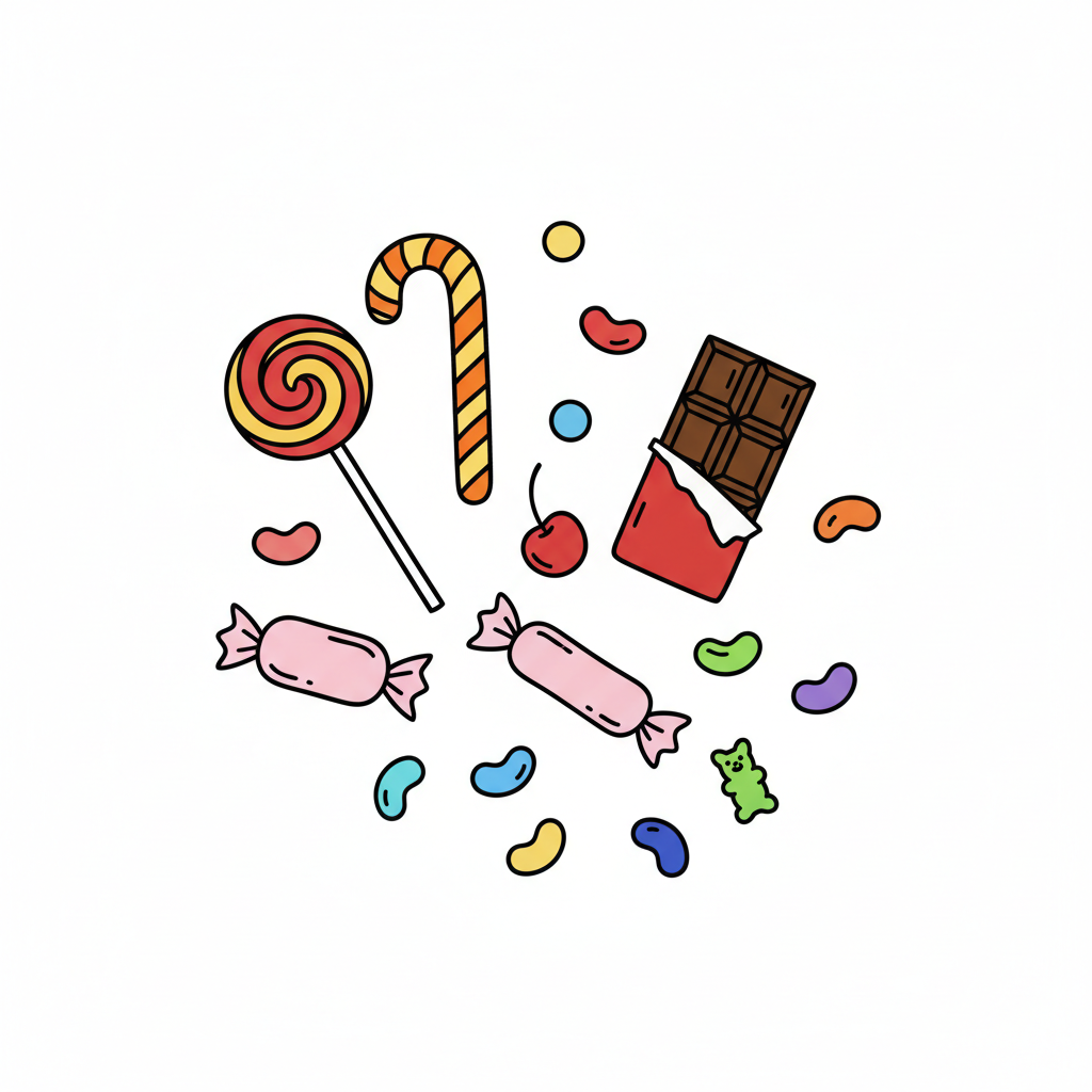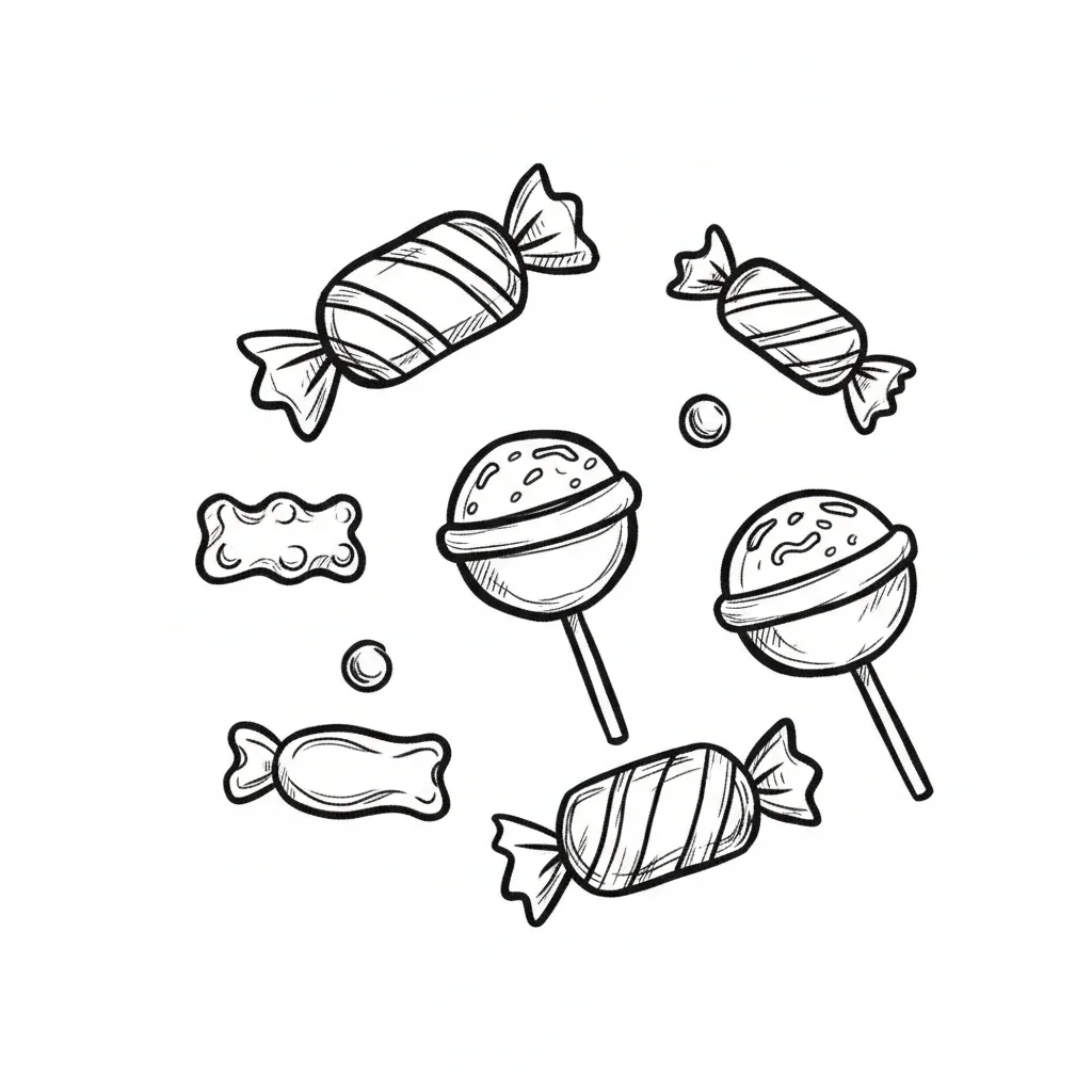 Schwarz-weiße Skizze verschiedener Süßigkeiten wie Lutscher, Bonbons und Gummibärchen.