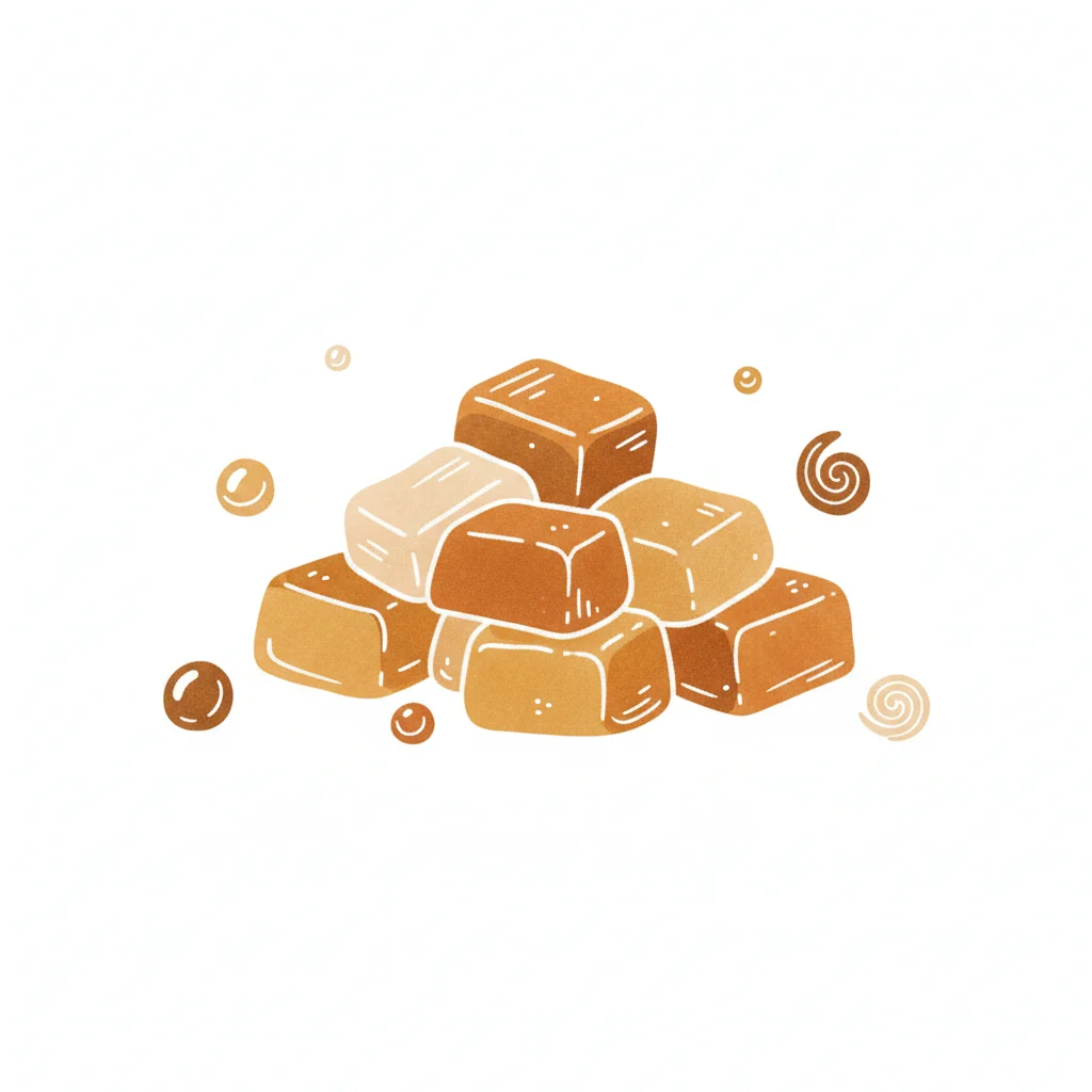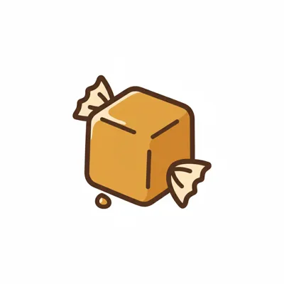 Illustration eines goldbraunen Karamellbonbons in Würfelform, verpackt mit gedrehten Enden.