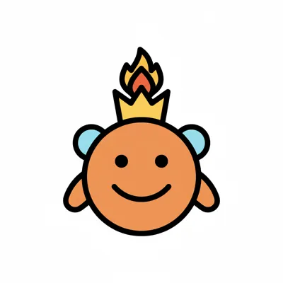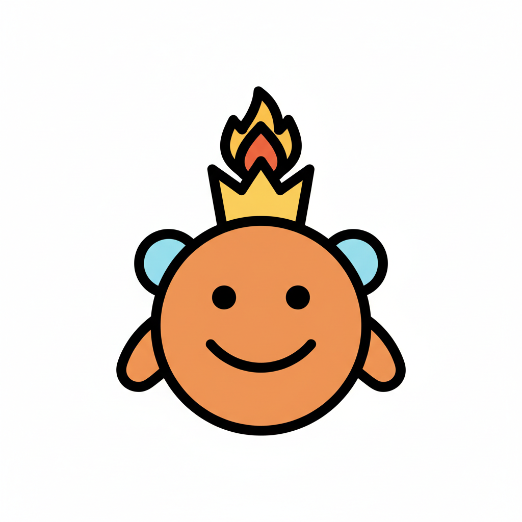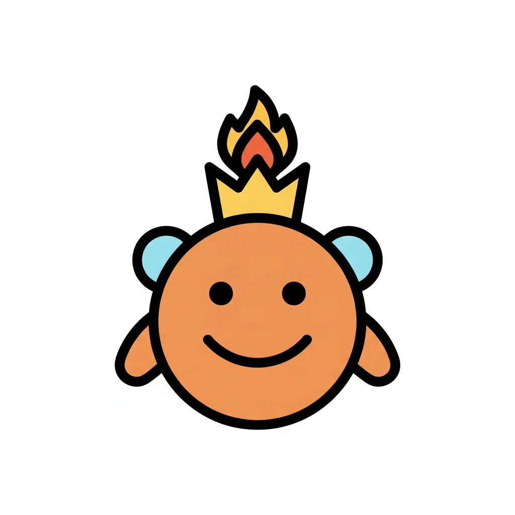 Glückliches orangefarbenes Wesen mit blauen Ohren und einer goldenen Krone mit Flamme.