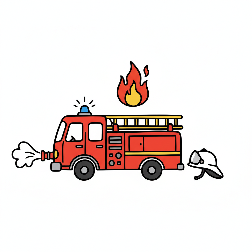 Cartoon-Stil rotes Feuerwehrauto spritzt Wasser, mit Feuersymbol und Feuerwehrhelm daneben.