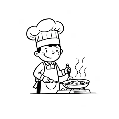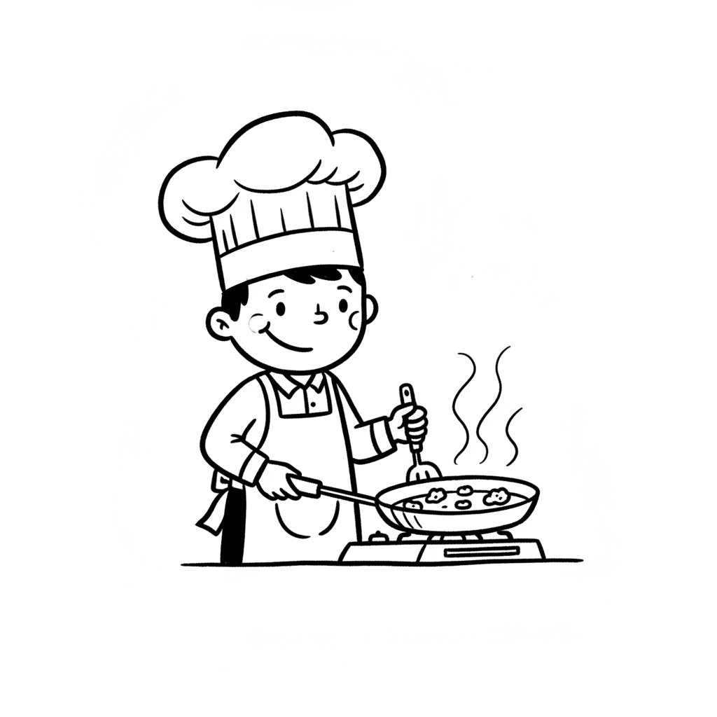 Ein lächelnder Cartoon-Koch rührt Essen in einer Pfanne auf dem Herd. Schwarz-Weiß-Zeichnung.