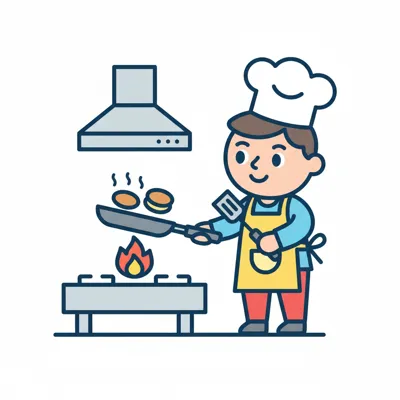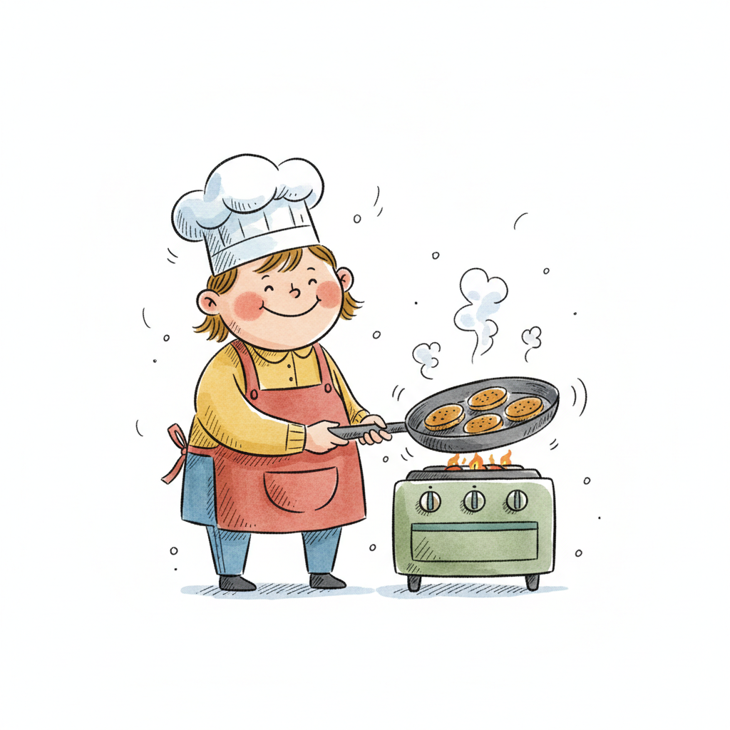 Fröhlicher Cartoon-Koch mit Kochmütze und Schürze brät Pfannkuchen auf einem Herd.
