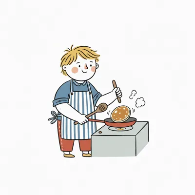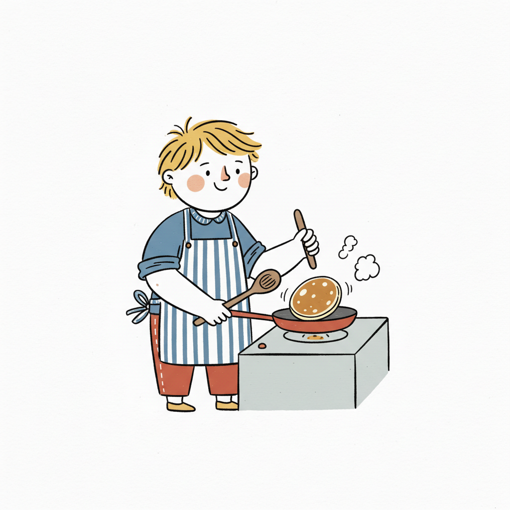 Ein fröhlicher Cartoon-Koch mit Kochmütze und Schürze brät Pfannkuchen am Herd.