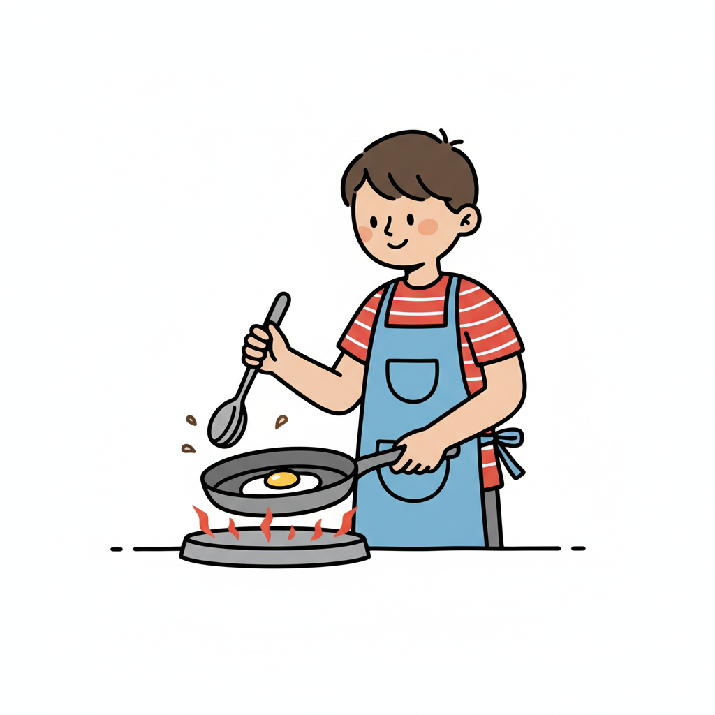Ein lächelnder Cartoon-Junge brät ein Ei in einer Pfanne auf dem Herd, trägt eine blaue Schürze.