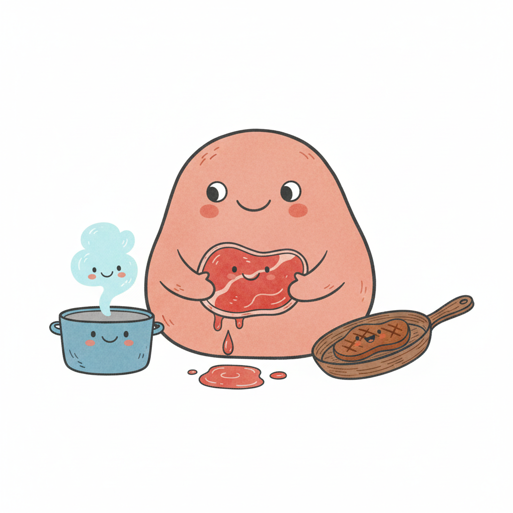 Cartoon-Figur mit Fleisch im Bauch, umgeben von kochendem Topf und gebratener Steakpfanne.