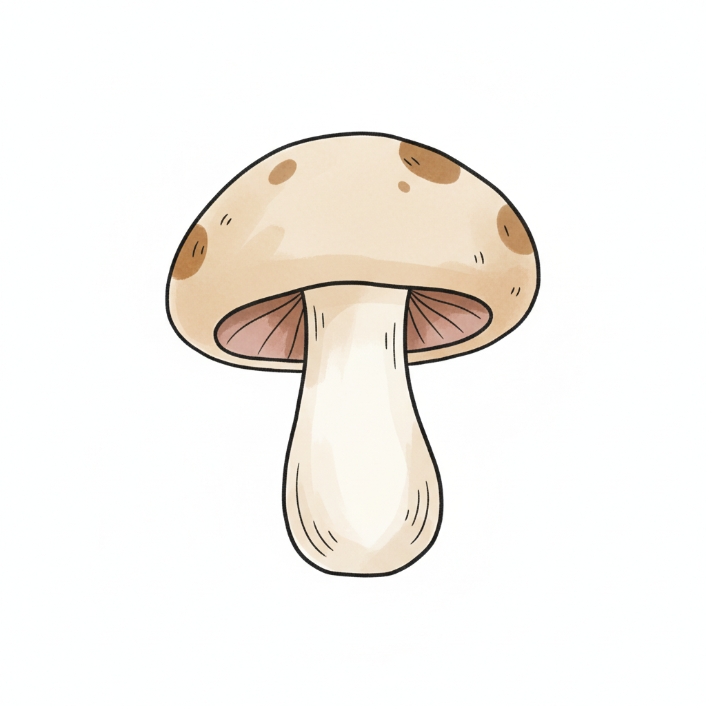 Ein gezeichneter Pilz mit braunen Punkten und einem weißen Stiel.