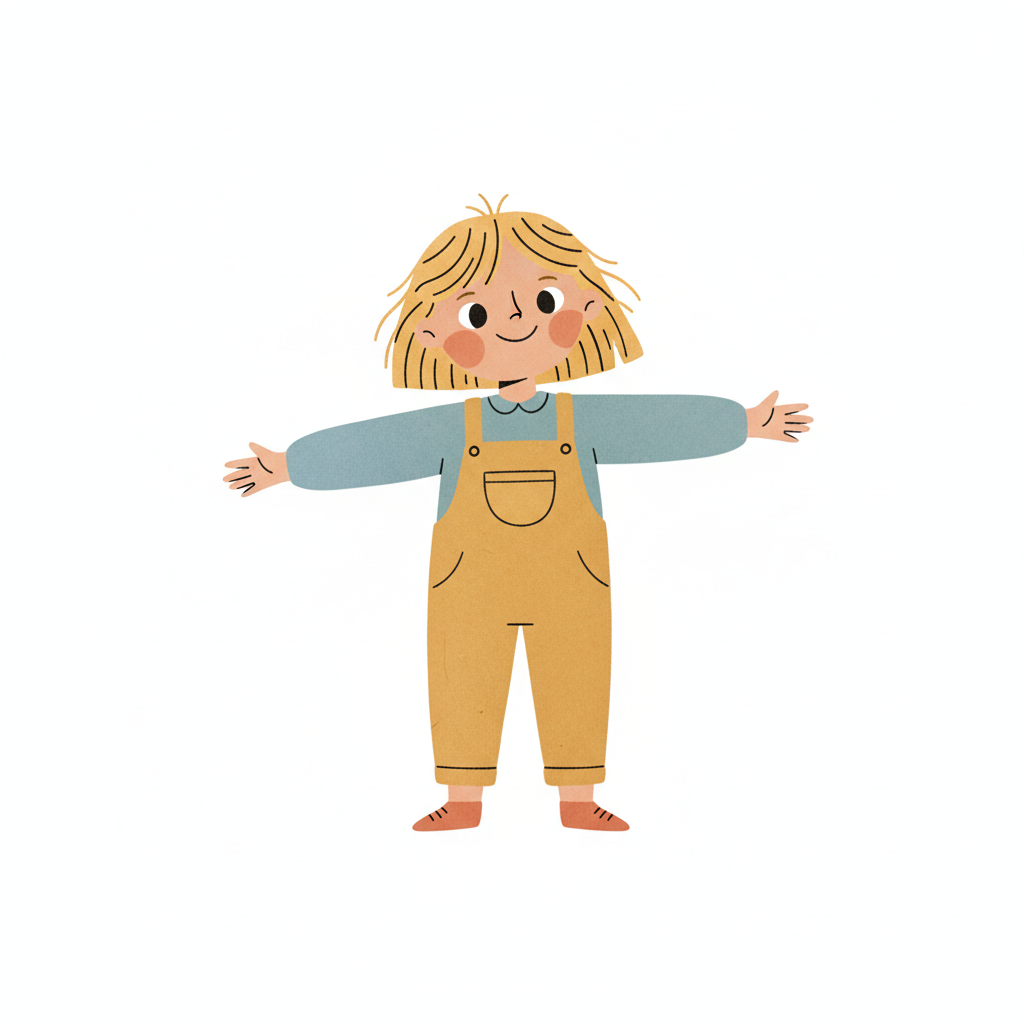 Handgezeichnete Kinderbuchillustration im modernen skandinavisch-nordischen Stil. Minimalistische, freundliche Figur mit einfachen Formen und leicht unregelmäßigen, handgezeichneten Linien. Ruhige, gedeckte Farbpalette, viel freie Fläche, reduzierte Details, sanfte Papier- oder Aquarellstruktur. Warme, ruhige, leicht humorvolle Stimmung, flächige Komposition ohne starke Perspektive, moderner nordischer Illustrationsstil, charmant und zeitlos.