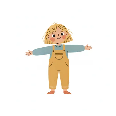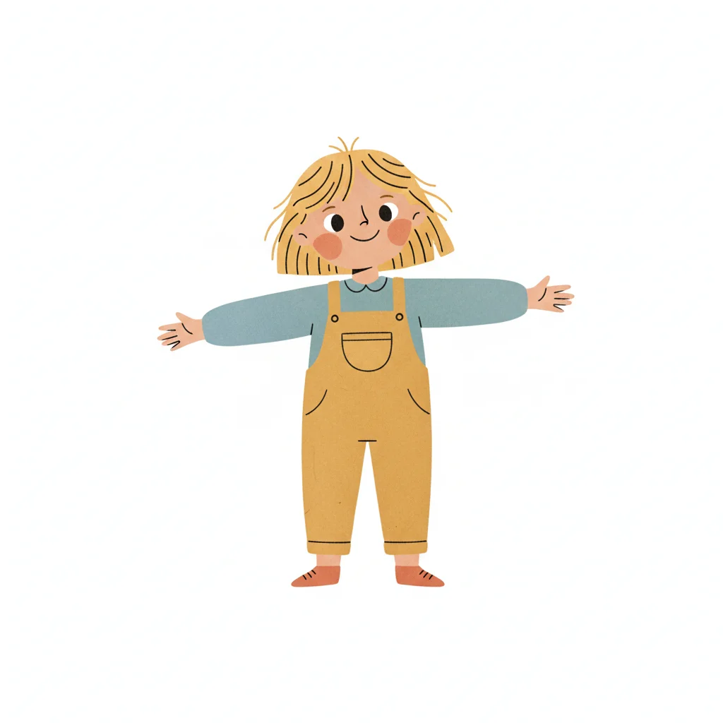 Ein fröhliches Kind mit blonden Haaren und Latzhose, das die Arme ausbreitet.