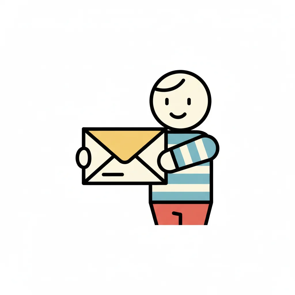 Lächelnde Cartoon-Figur in gestreiftem Shirt hält einen Briefumschlag.