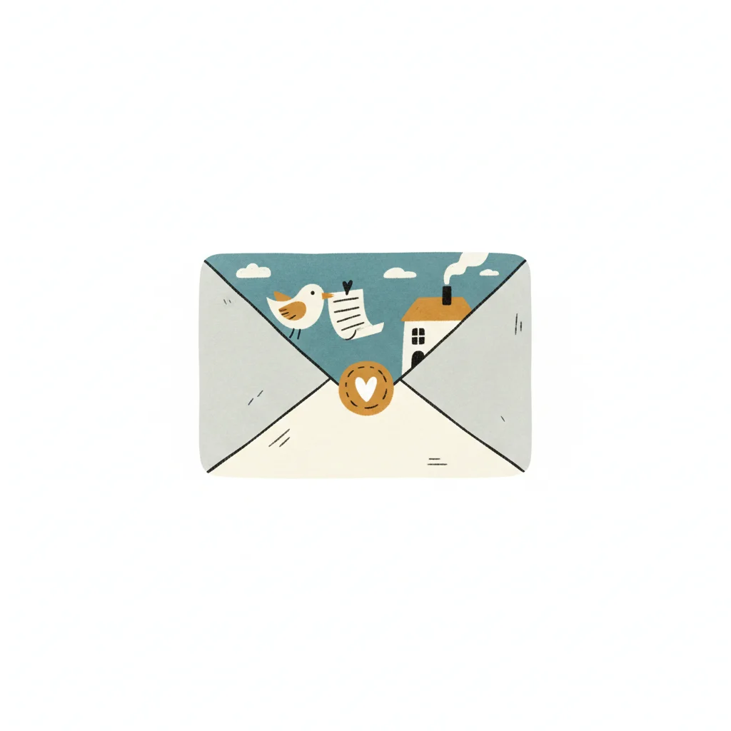 Niedliche Illustration: Offener Briefumschlag mit Vogel, Brief, Haus und Herz-Siegel.