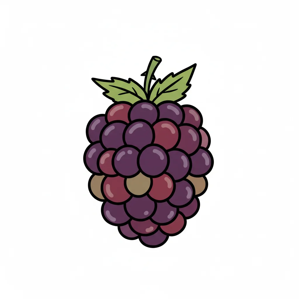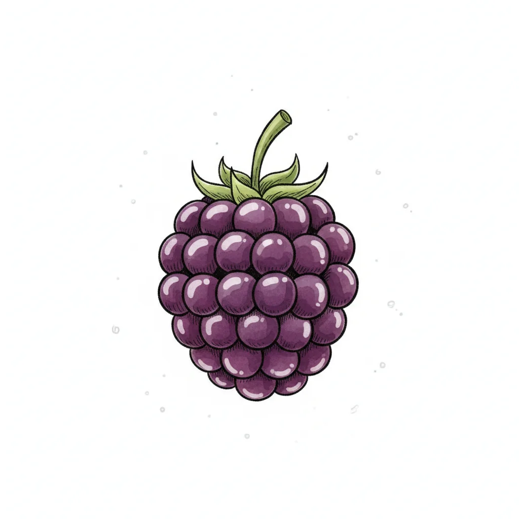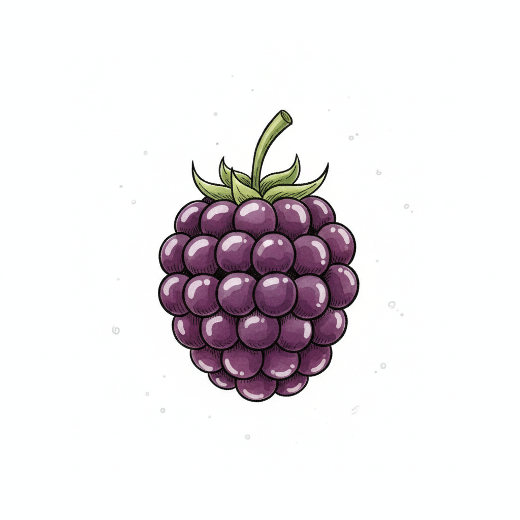 Eine Illustration einer reifen, lila Brombeere mit grünen Blättern.