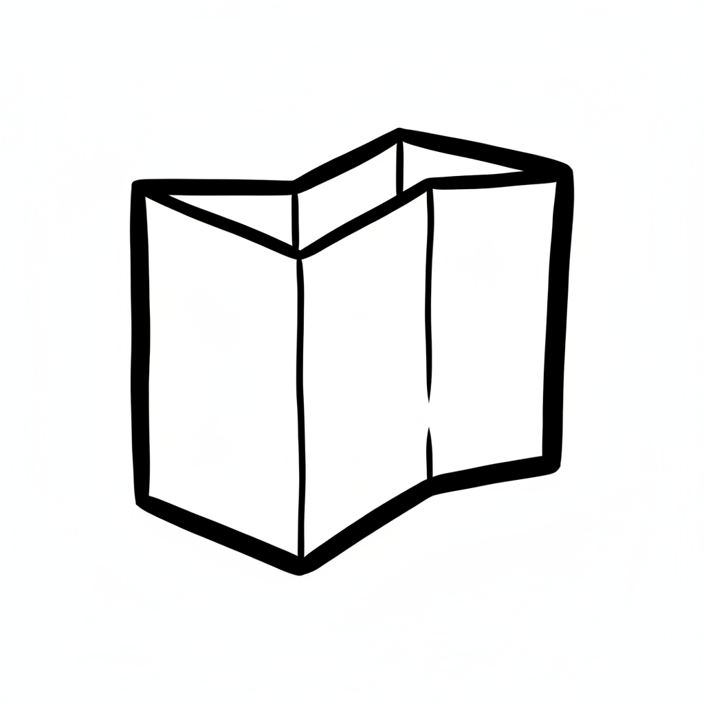 Einfache, schwarz-weiße Strichzeichnung einer gefalteten Karte oder Broschüre.