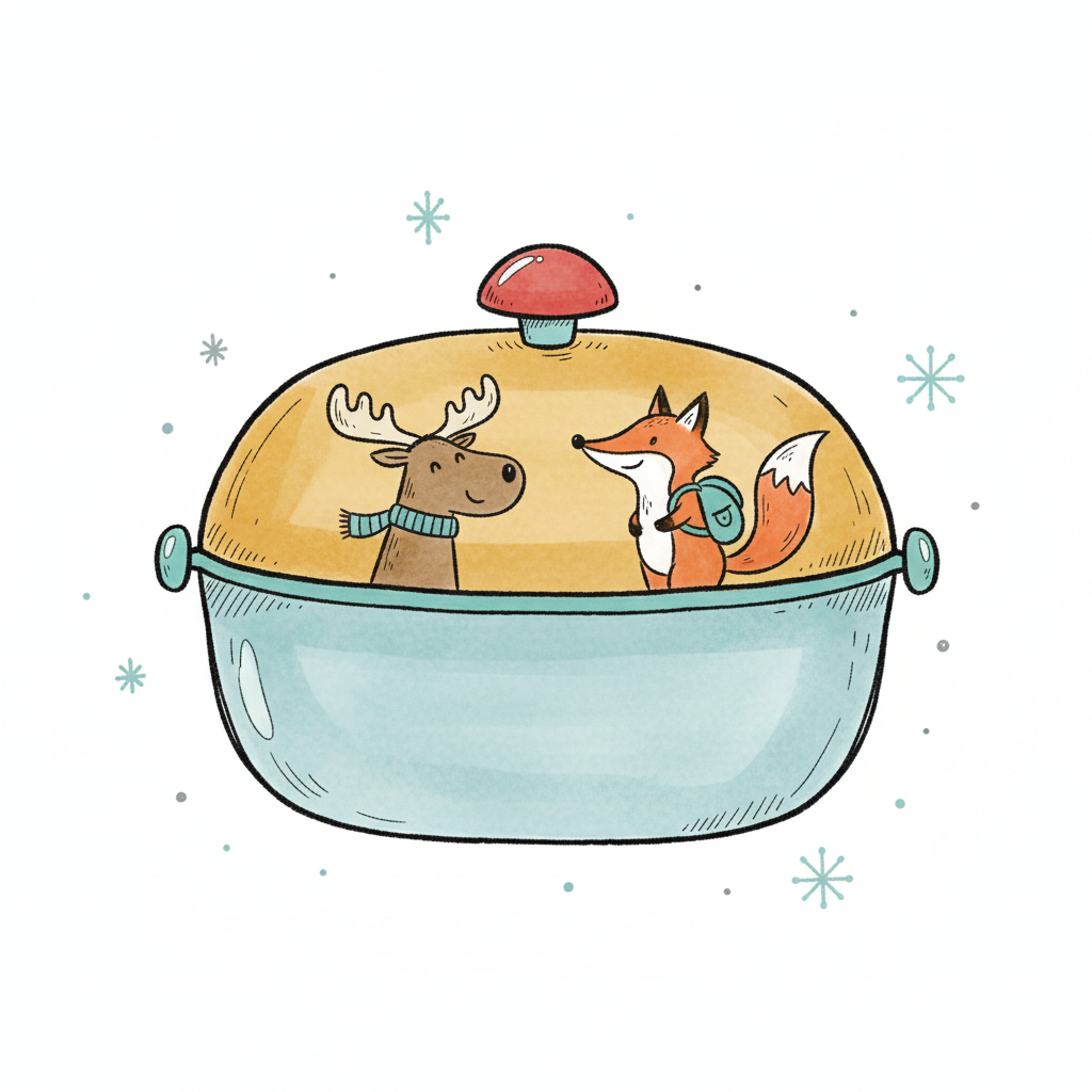 Ein Reh und ein Fuchs sitzen in einem bunten Topf.