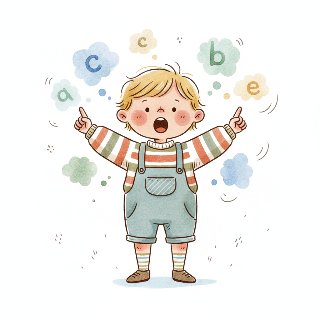 Ein fröhlicher Junge, der die Buchstaben a, b, c ruft.