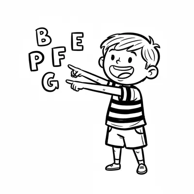 Ein fröhlicher Junge zeigt auf Buchstaben in der Luft.