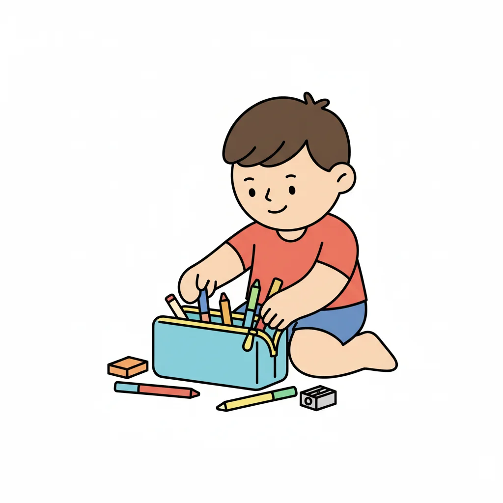 Ein Junge sortiert Buntstifte in einer Federtasche.