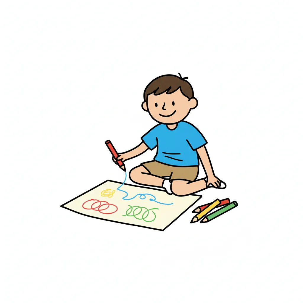 Ein Junge zeichnet fröhlich mit Buntstiften auf einem Blatt Papier.