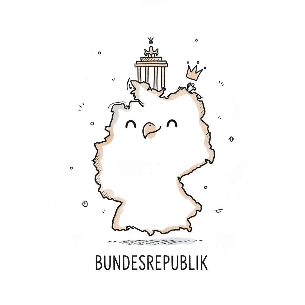Niedliche Cartoon-Karte Deutschlands mit Gesicht, Brandenburger Tor und Krone, Schriftzug 'Bundesrepublik'.