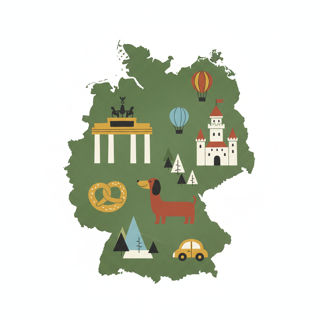 Illustrierte Deutschlandkarte mit Wahrzeichen wie Brandenburger Tor, Schloss, Dackel, Brezel.