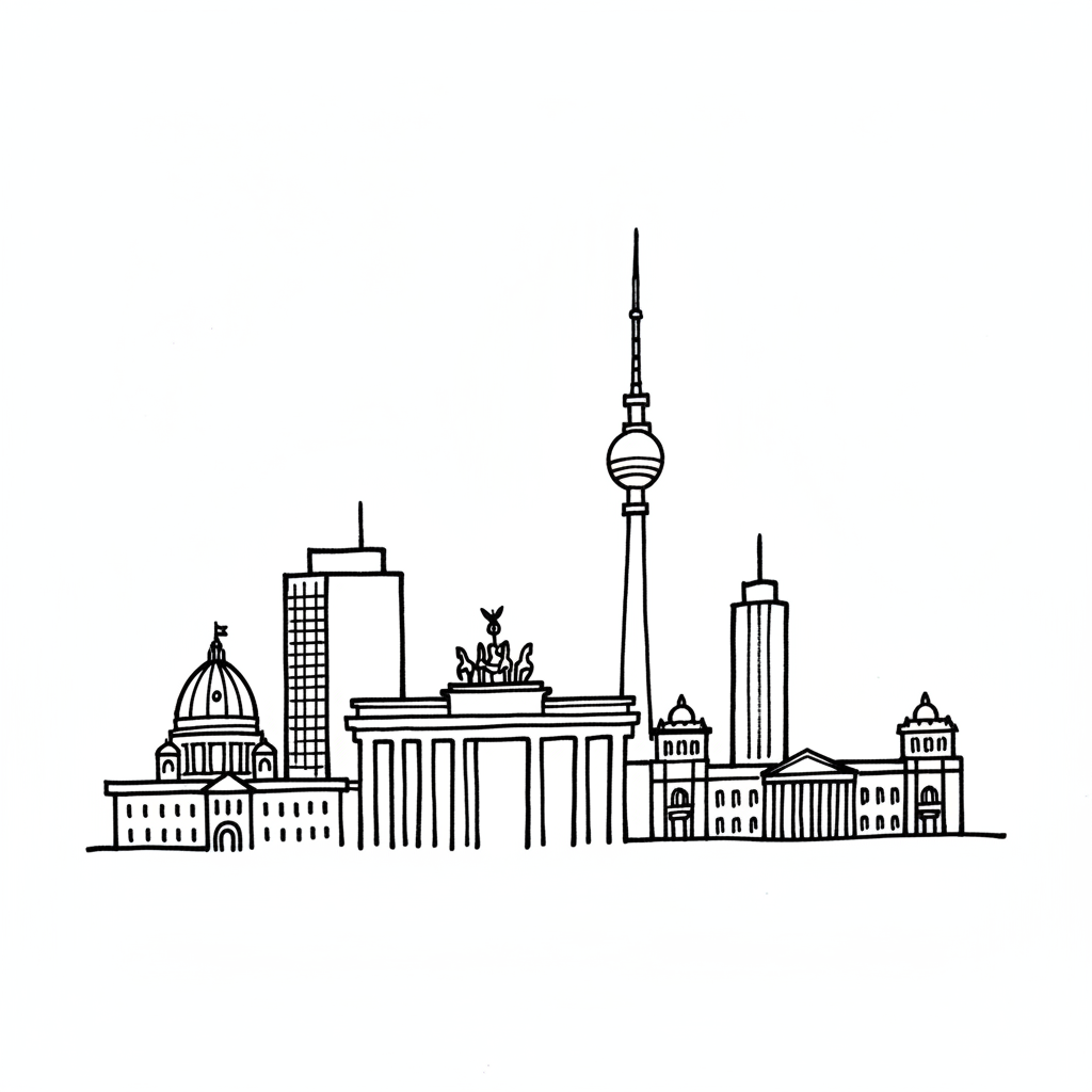 Minimalistische Schwarz-Weiß-Zeichnung der Berliner Skyline mit Fernsehturm und Brandenburger Tor.
