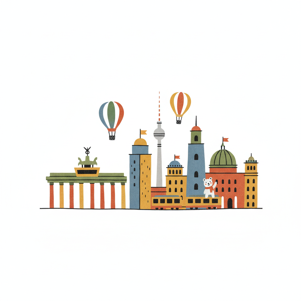 Bunte Illustration der Berliner Skyline mit Brandenburger Tor, Fernsehturm und Heißluftballons.