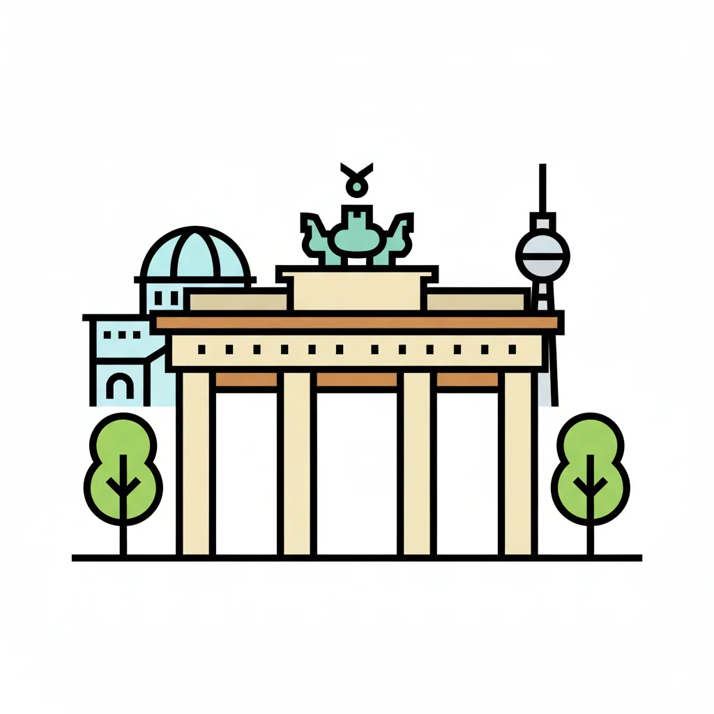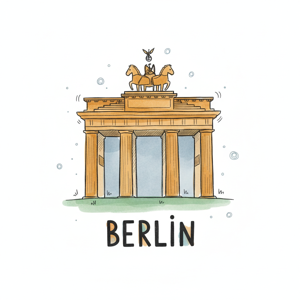 Cartoon-Illustration des Brandenburger Tors mit Quadriga und dem Schriftzug 'BERLIN'.