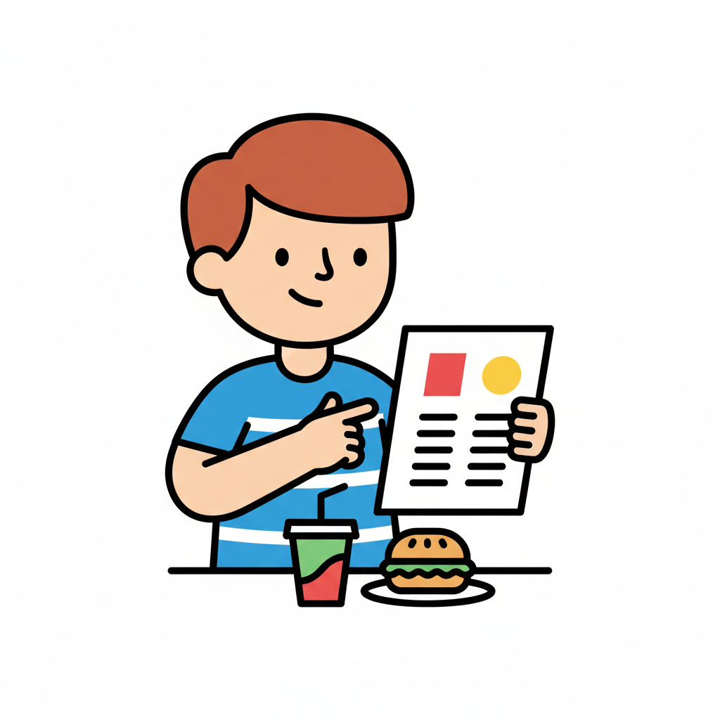 Ein lächelnder Junge zeigt auf eine Speisekarte, daneben Burger und Getränk.