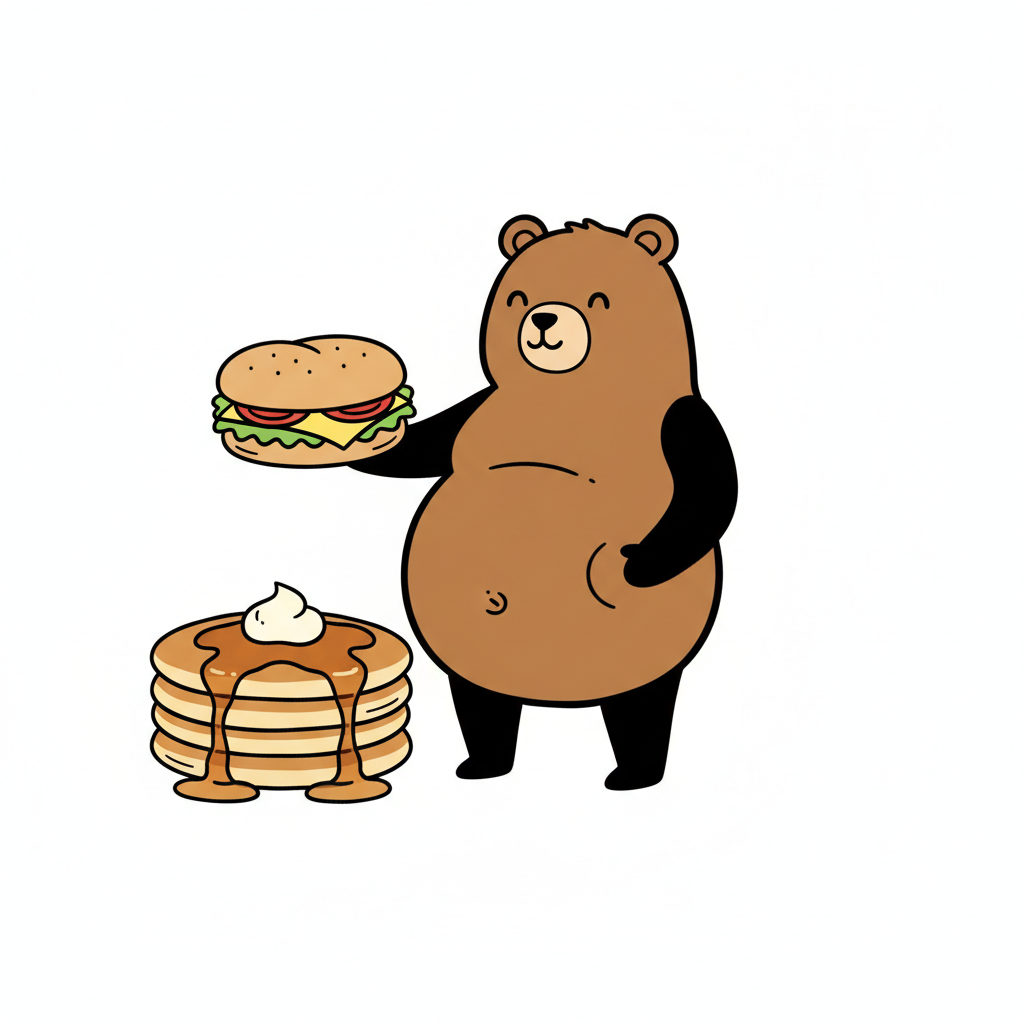 Glücklicher Cartoon-Bär mit dickem Bauch, der einen Burger hält, daneben Pfannkuchen.
