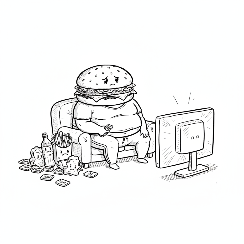 Trauriger Burger-Mensch sitzt vor dem TV, umgeben von Fast Food und Zucker. Symbolisiert ungesunden Lebensstil.