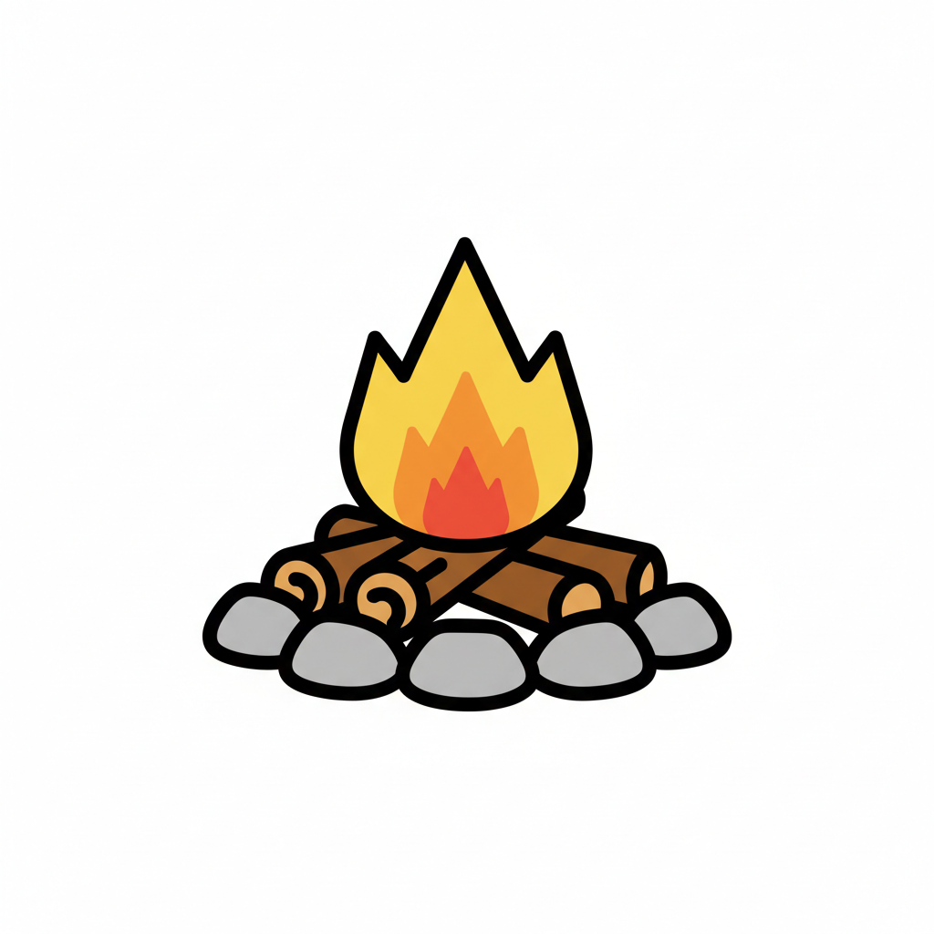 Ein stilisiertes Lagerfeuer mit Holzscheiten und Steinen, das hell brennt.