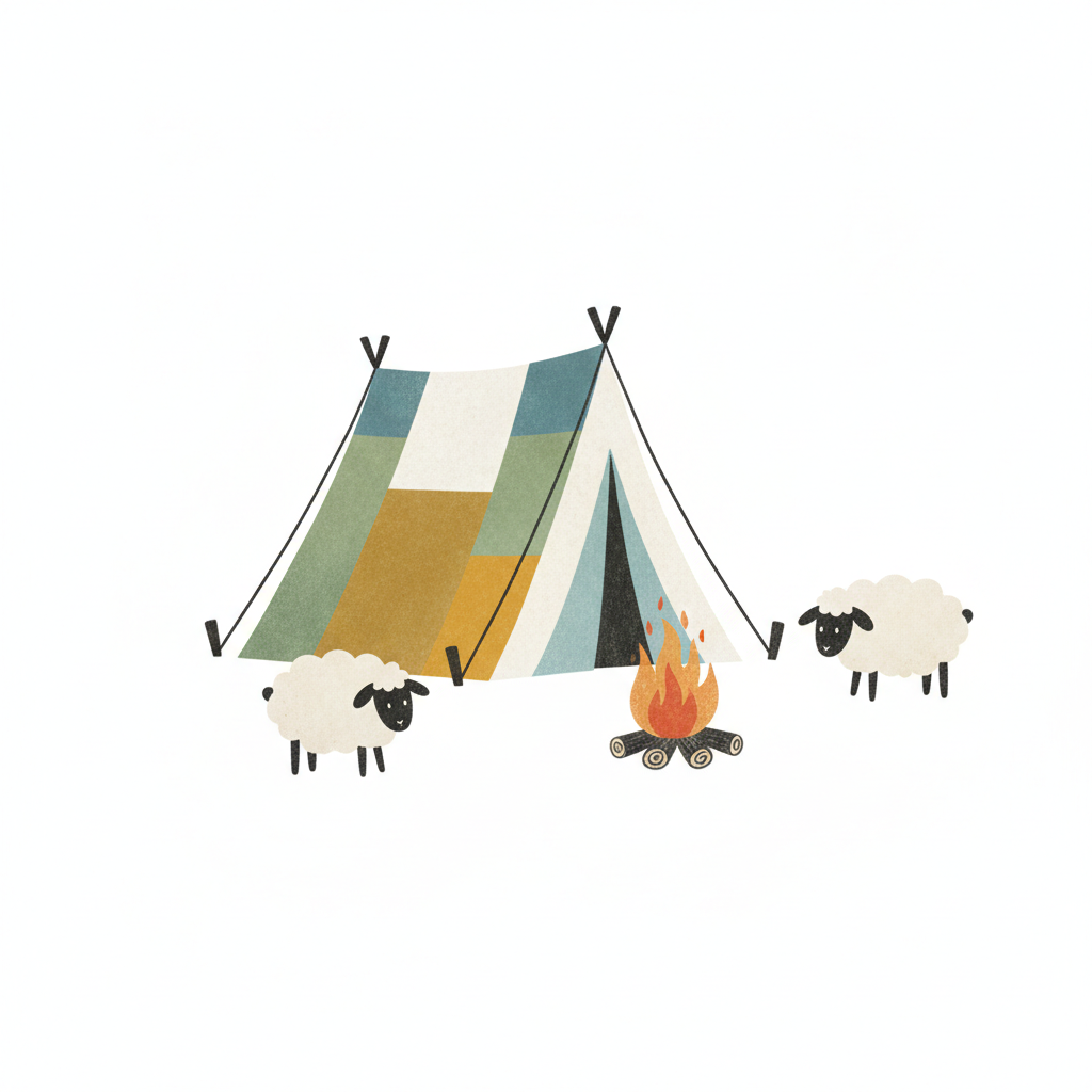 Niedliche Illustration eines Zeltes mit Lagerfeuer und zwei Schafen auf weißem Hintergrund.