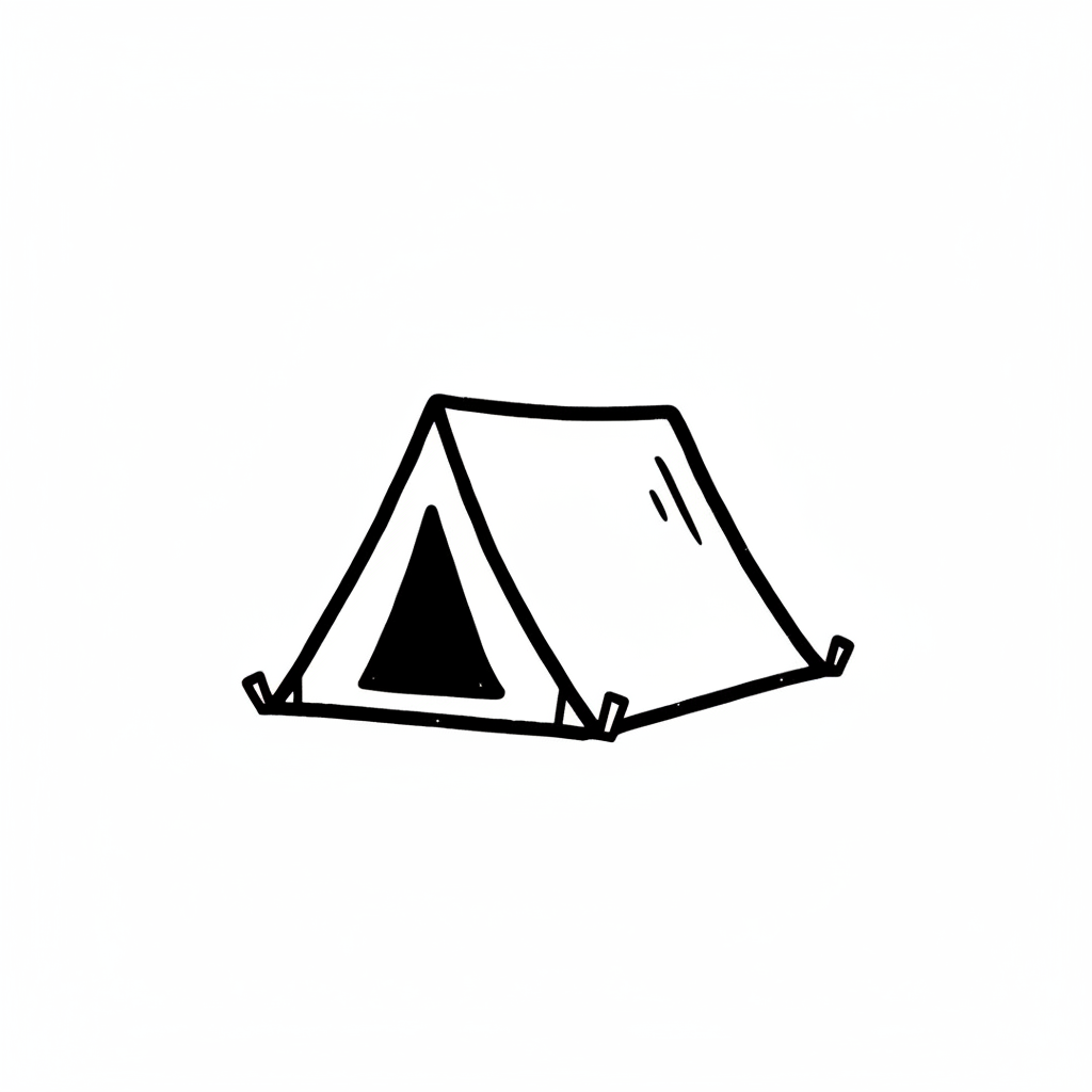 Schwarz-weiße, handgezeichnete Skizze eines Zeltes mit schwarzem Eingang auf weißem Hintergrund.