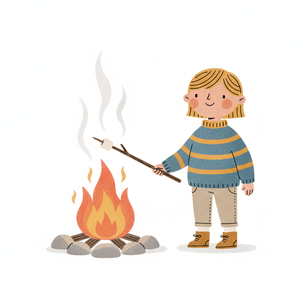 Illustration eines Lagerfeuers mit brennenden Holzscheiten und zwei Personen, die Marshmallows rösten.