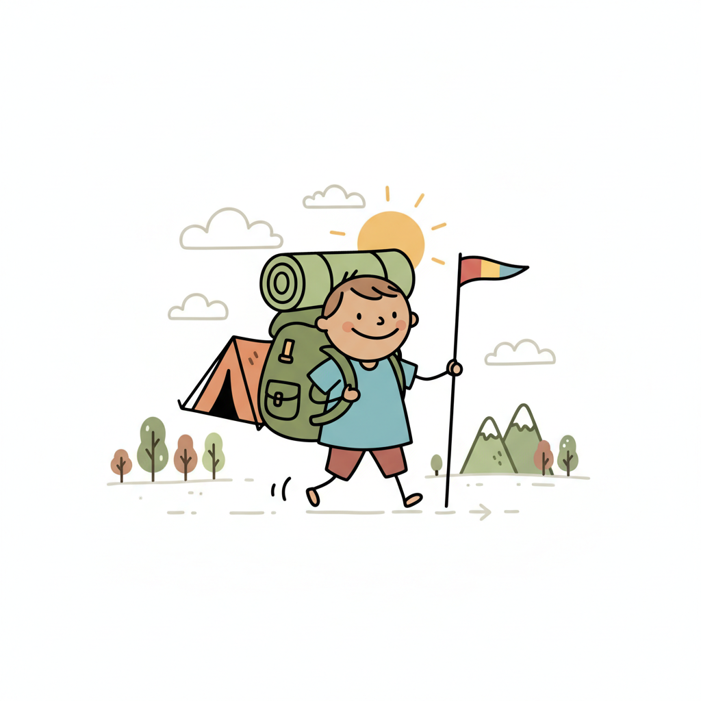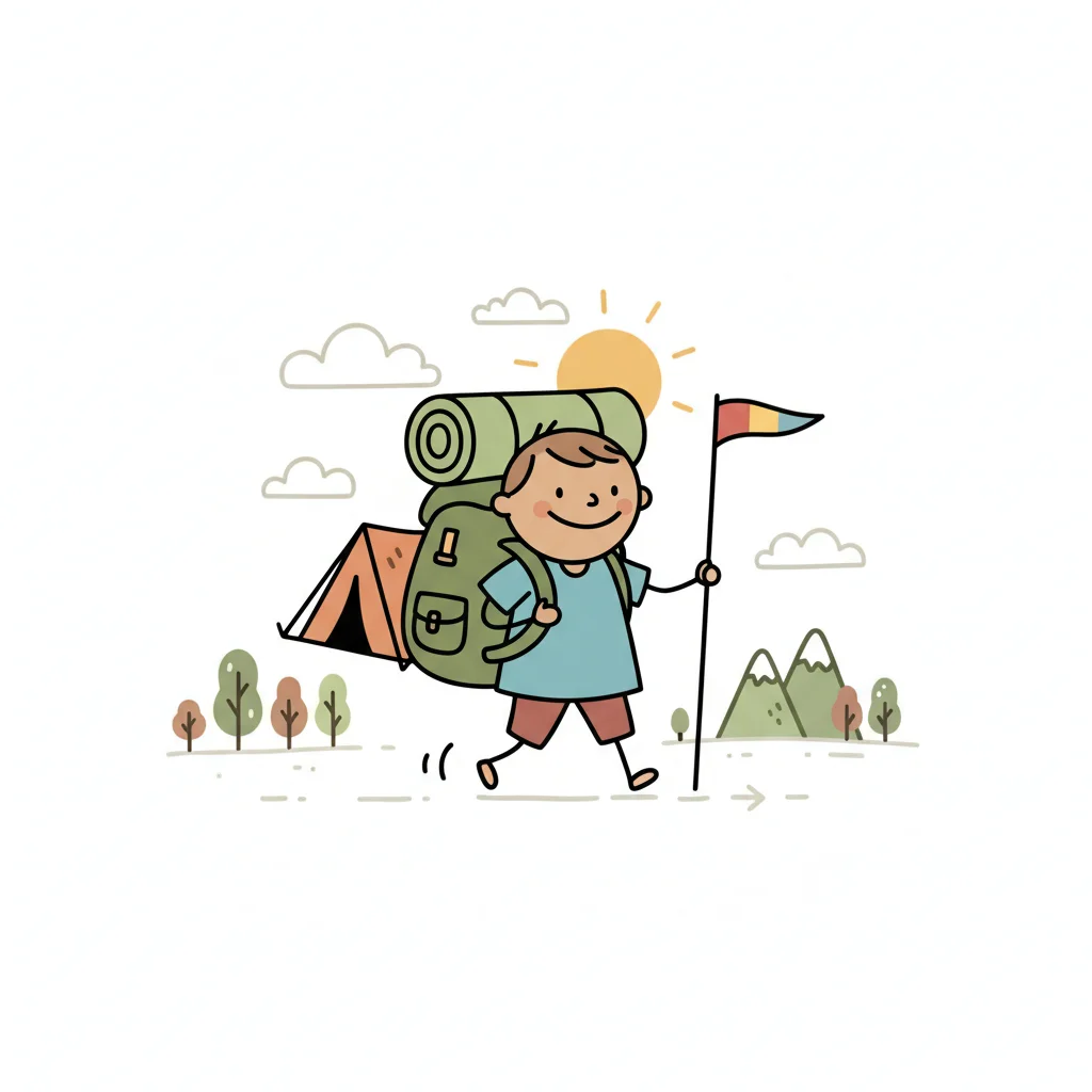 Fröhliches Cartoon-Kind wandert mit Rucksack und Fahne durch die Natur, umgeben von Zelt, Bergen und Sonne.