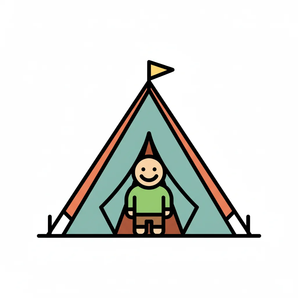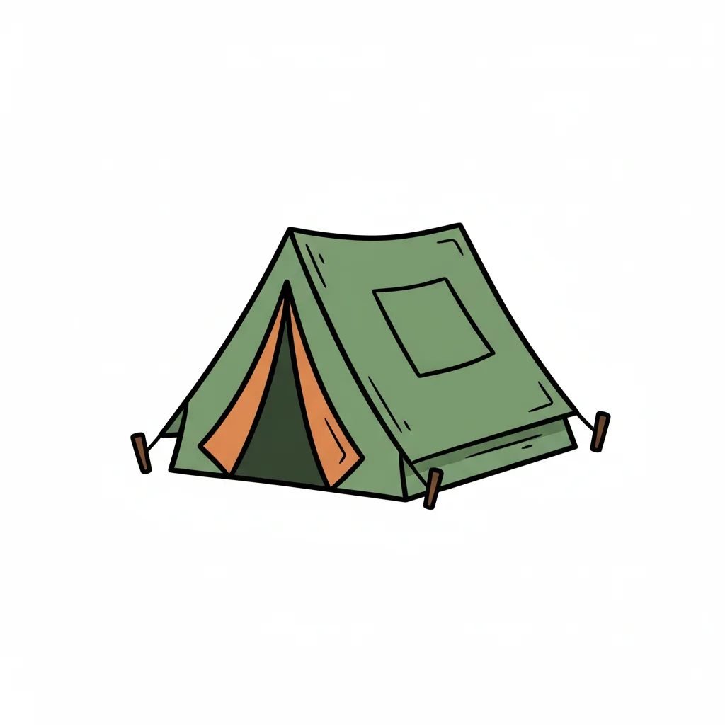 Cartoon-Zeichnung eines grünen Zeltes mit offenem Eingang und kleinem Fenster auf weißem Hintergrund.
