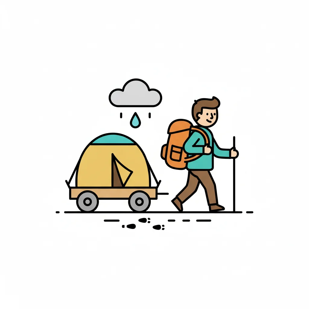 Ein Wanderer mit Rucksack und Stock zieht ein Zelt auf Rädern unter einer Regenwolke.
