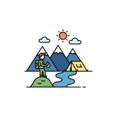 Illustration: Wanderer mit Rucksack vor Bergen, Fluss und Zelt unter Sonne und Wolken.