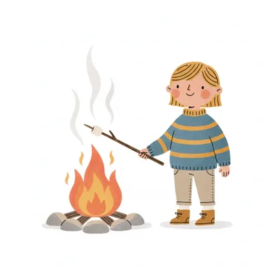 Illustration: Kind röstet Marshmallow über Lagerfeuer. Gemütliche Campingszene.