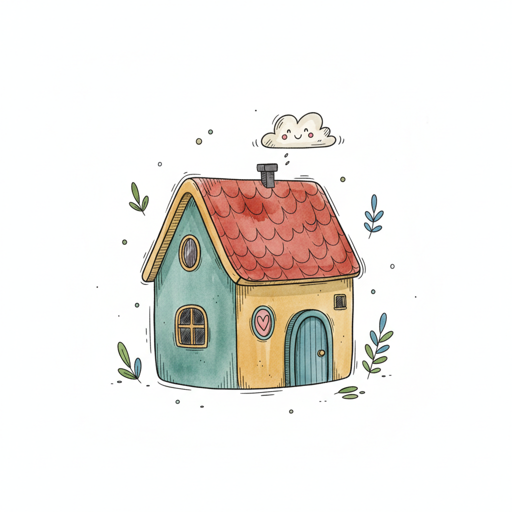 Niedliches, farbenfrohes Cartoon-Haus mit rotem Dach und lächelnder Wolke im Aquarellstil.