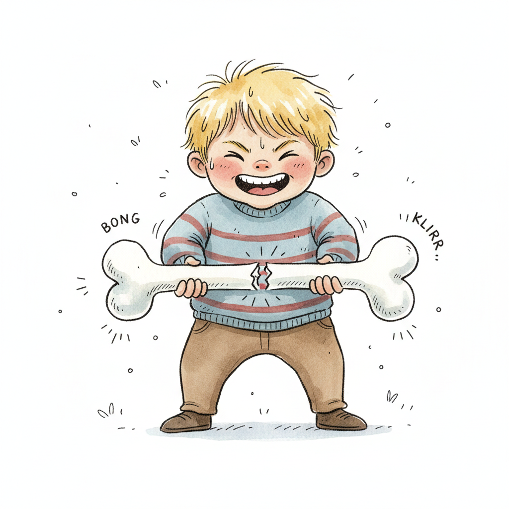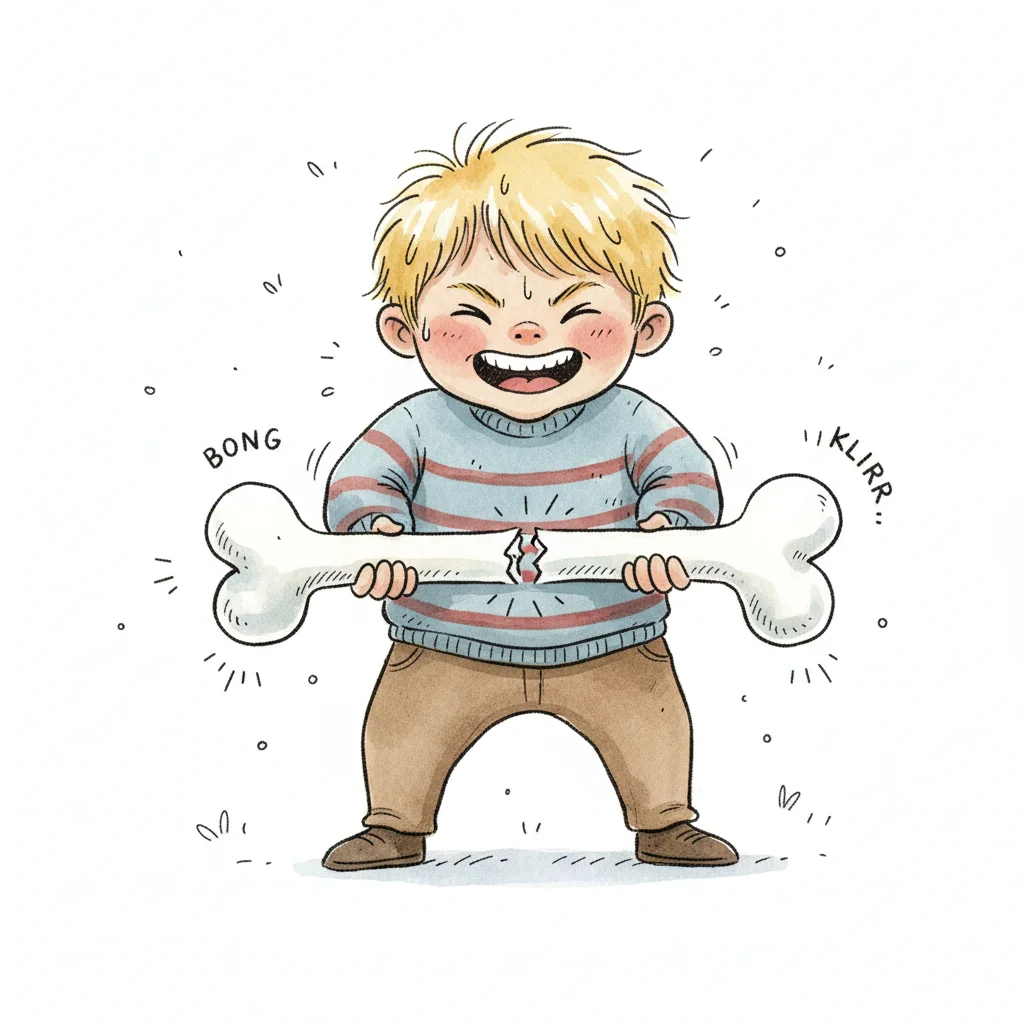 Ein Cartoon-Junge zerbricht mit Anstrengung einen großen Knochen, begleitet von Geräuscheffekten.