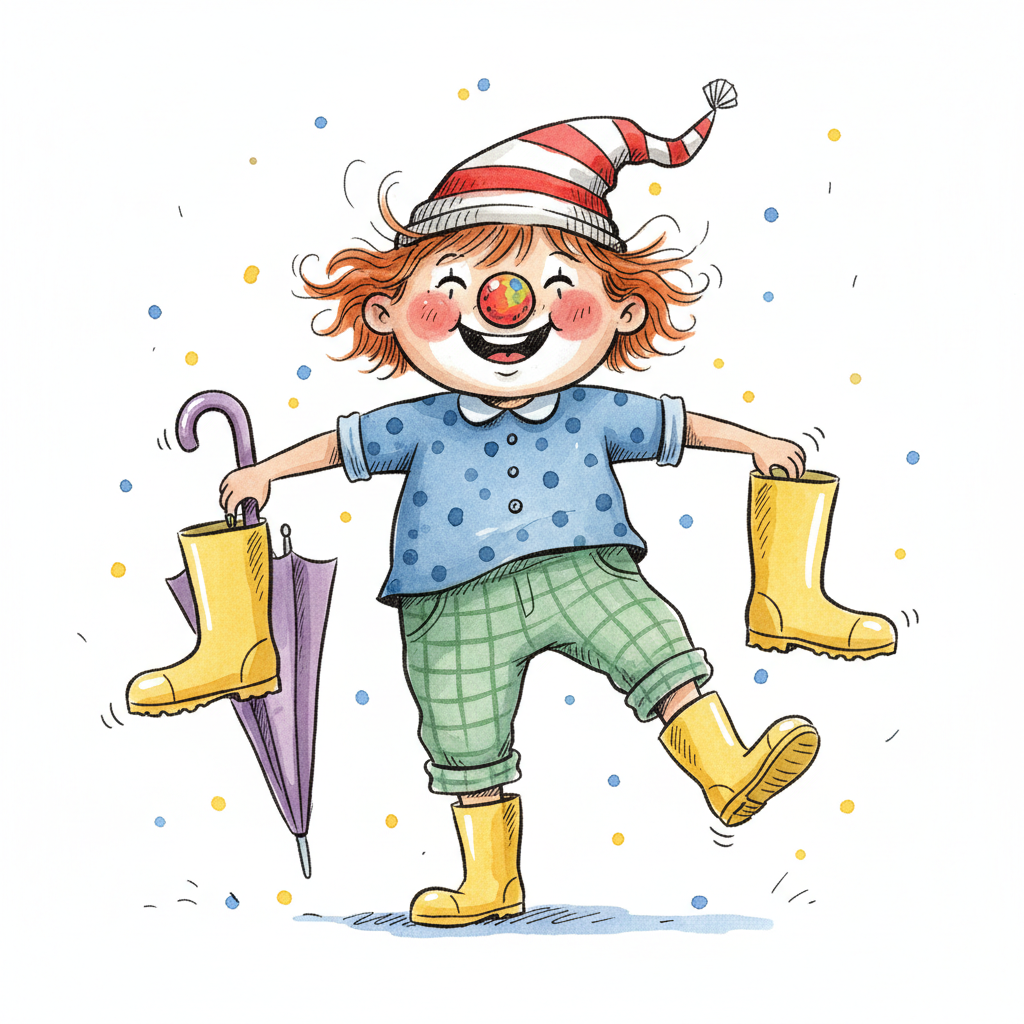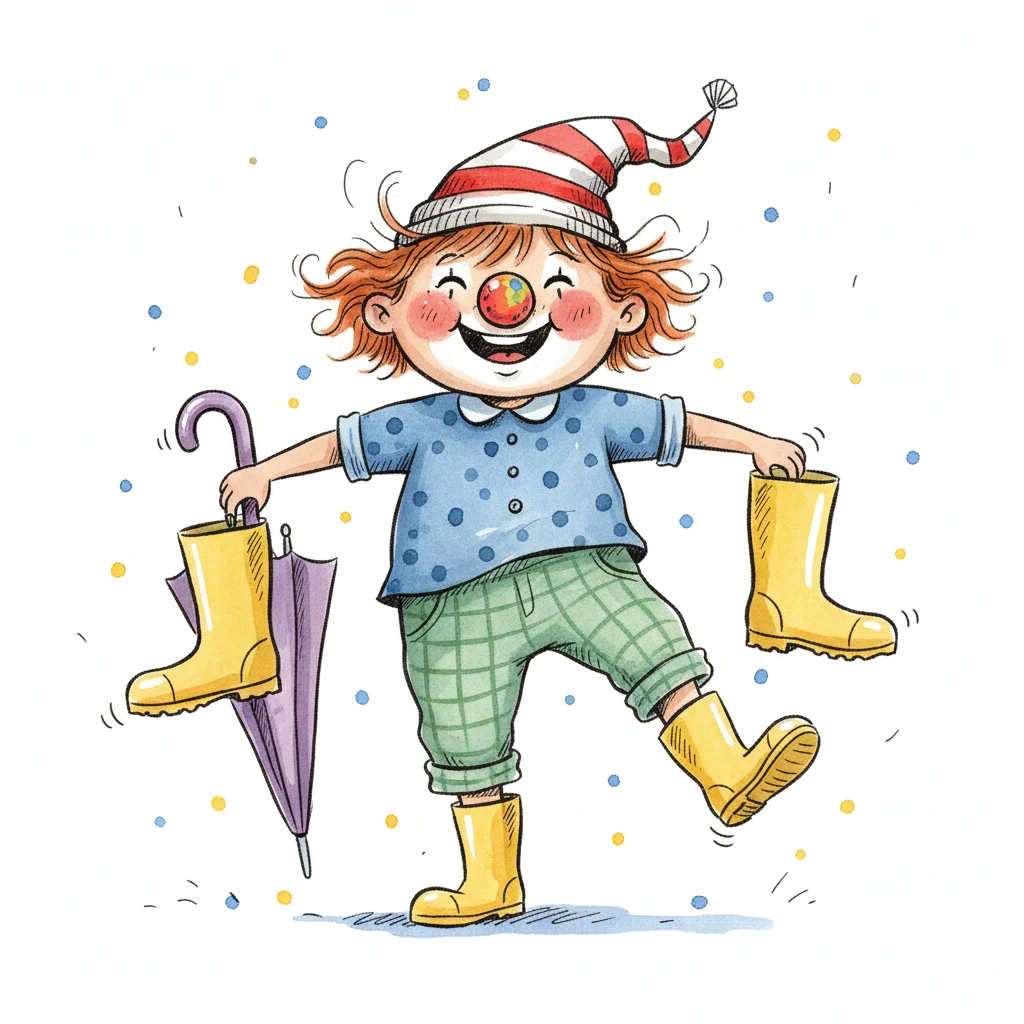 Cartoon-Kind mit Clownsnase, Gummistiefeln und Regenschirm tanzt fröhlich.