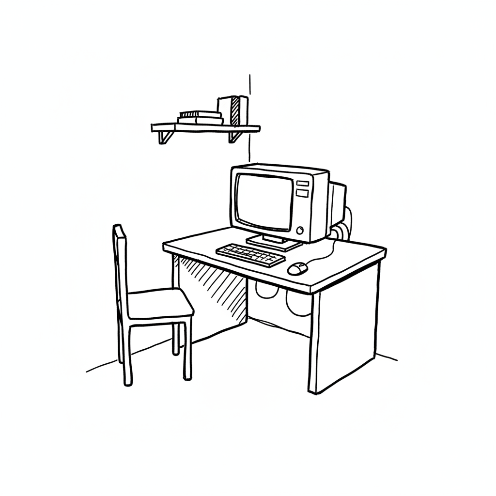 Ein einfacher Schreibtisch mit Computer und Stuhl.